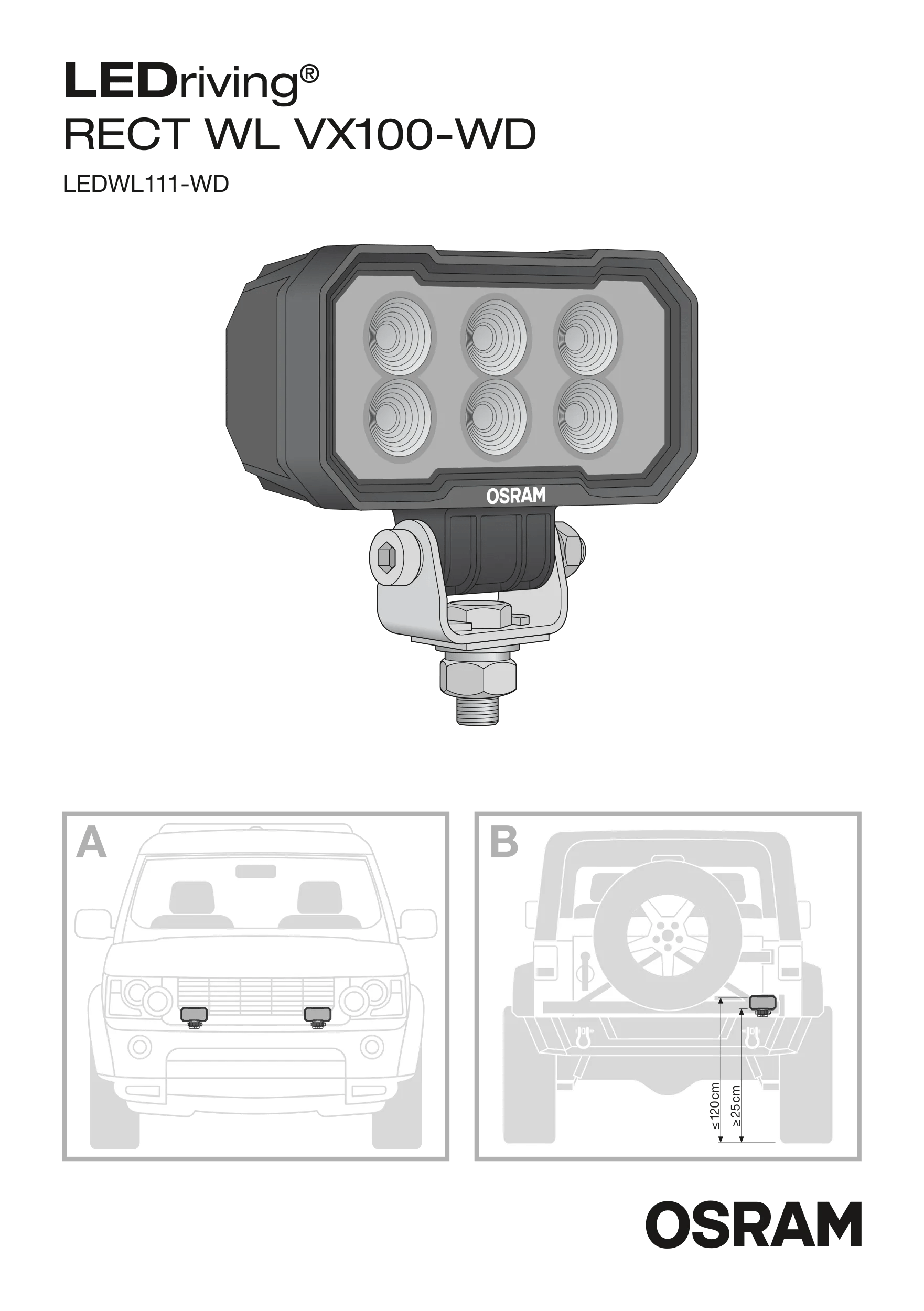 Experience exceptional visibility with the OSRAM LEDriving Rect WL VX100-WD – a compact, powerful wide beam LED working light that combines affordability with performance, quality and durability. Designed to meet diverse tasks, the working light impresses with a luminous flux of up to 2300 effective lumens and a wide beam pattern with a light beam up to 68 meters. Emitting a color temperature of up to 6000 Kelvin and equipped with 6 high-performance OSRAM LEDs, the working light delivers consistent and reliable brightness, significantly enhancing safety at work for you and others. Built for durability, the working light features a robust aluminum housing and a shatterproof polycarbonate lens. It withstands harsh environmental conditions such as dust, water, impacts, extreme temperatures and vibrations, meeting IP6K8 and IP6K9K standards verified in a certified environmental simulation laboratory. Versatile in its application, this LED working light is an effective addition to trucks, construction machinery, agricultural and commercial vehicles, as well as off-road vehicles. In addition, it is ECE R148 approved for use as a reversing light. Whether on the farm, on-site, or in the wilderness, the OSRAM LEDriving Rect WL VX100-WD is a reliable and efficient lighting solution that enhances performance and safety in challenging conditions1). OSRAM provides a 2-year guarantee2).